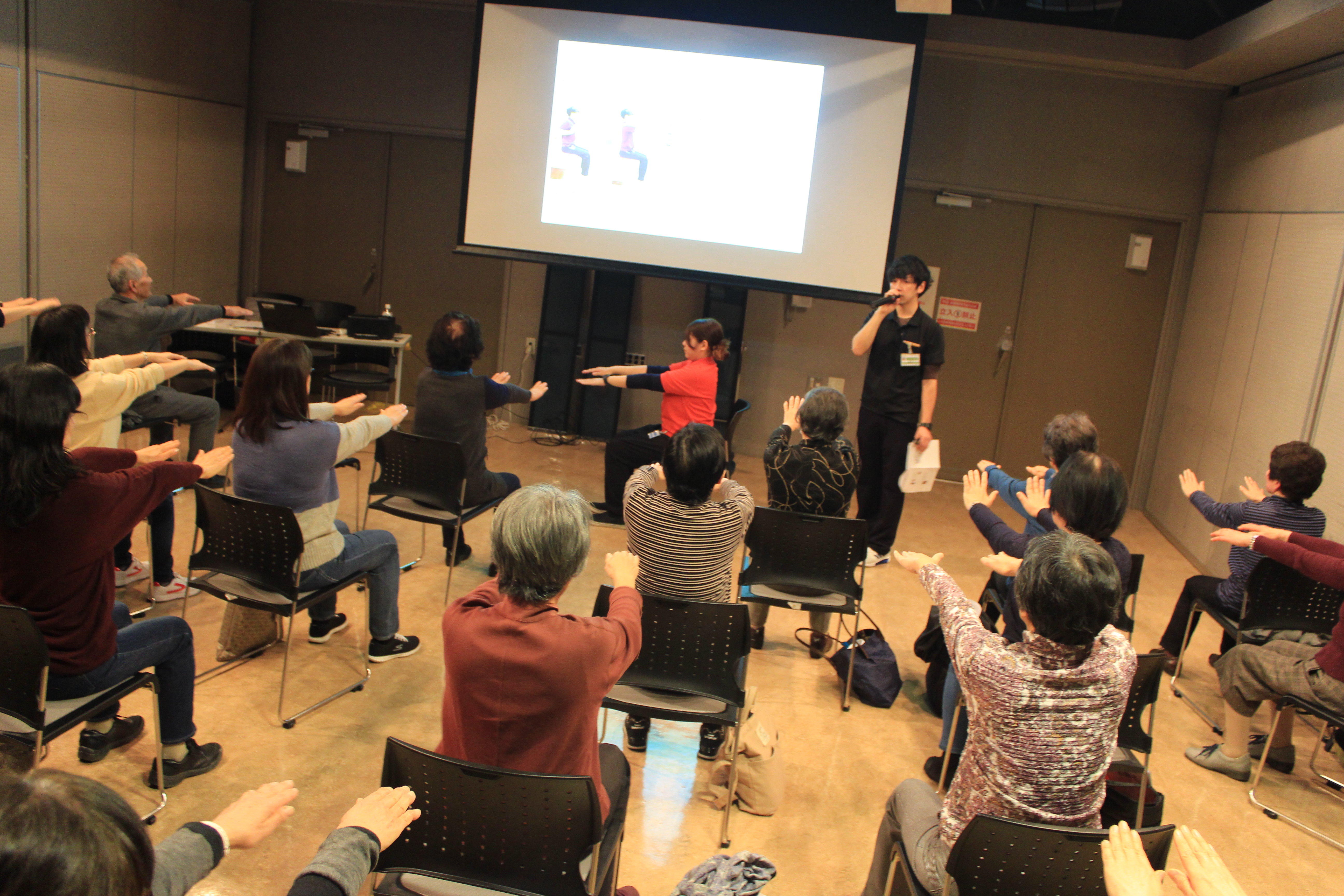 今回の講演では、詳しい原因を写真で解説し、必要な身体機能の低下を予防するためのトレーニング法やストレッチ法などを実演しました。