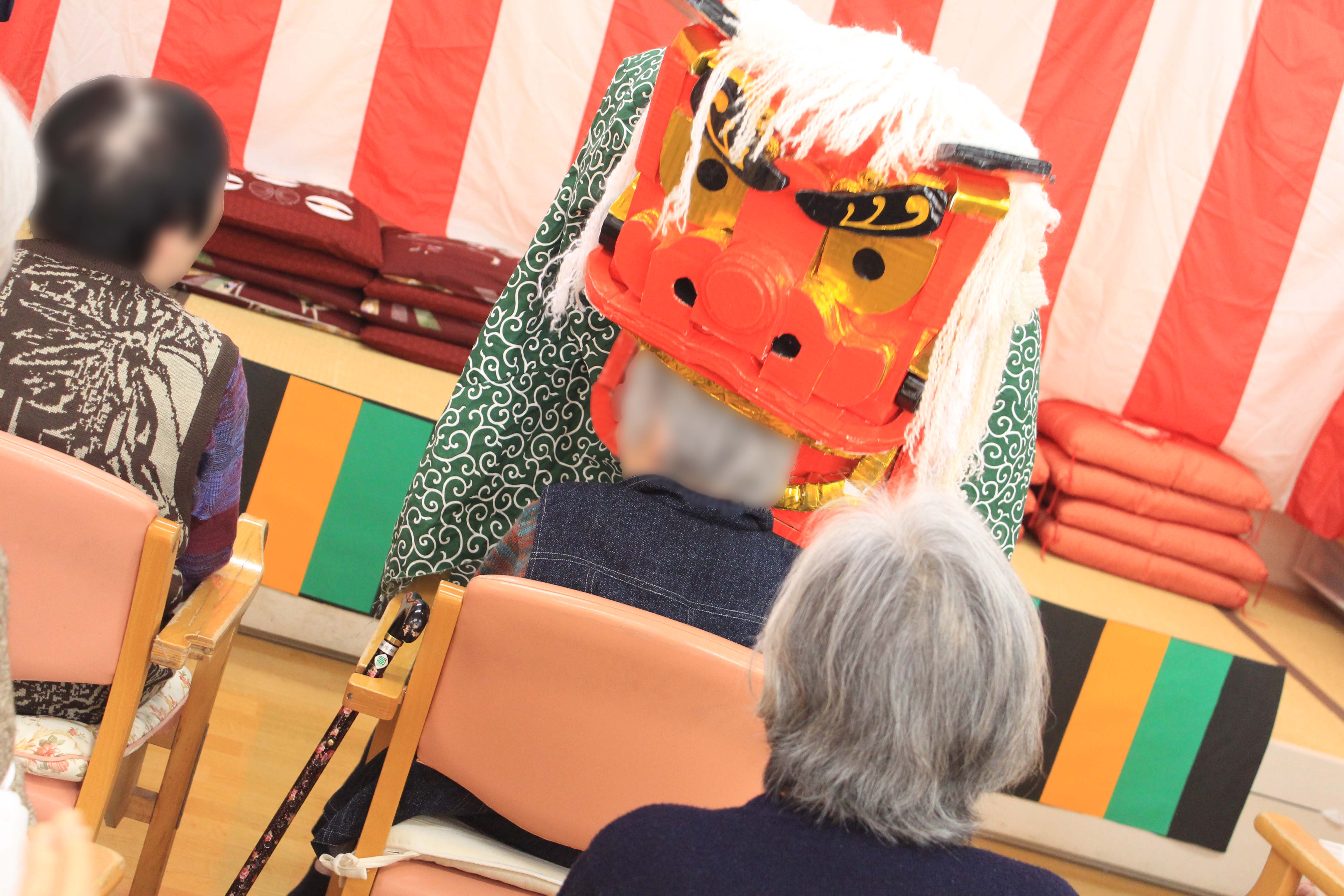 ガマの油売りの口上や歌謡ショー、獅子舞や福笑いなどに使用された小道具は、全て職員の手作りです。獅子は段ボール製で、口はもちろん耳も可動式の力作です!