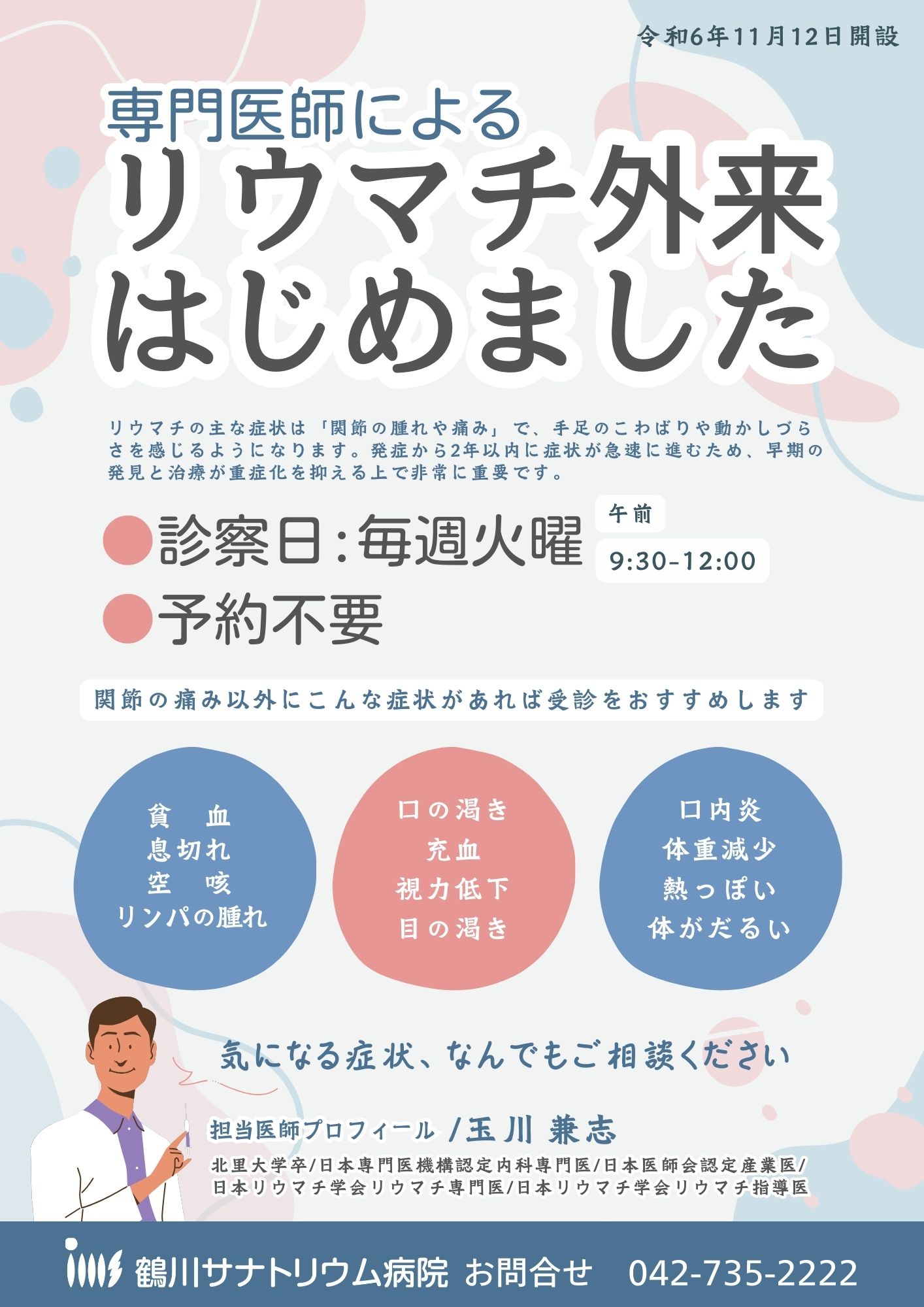 令和6年11月12日より、毎週火曜午前に『リウマチ外来』を開設いたします。