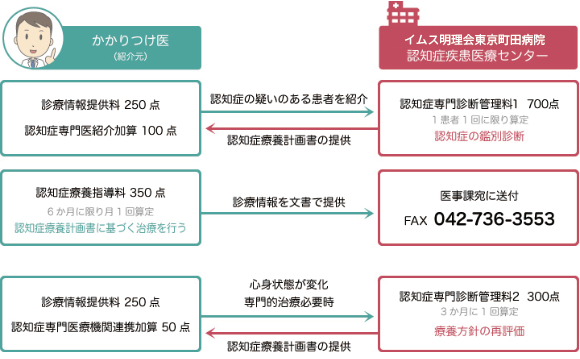 当センターをご利用いただきますと、診療情報提供料に加え紹介加算、連携加算、そして認知症療養指導料を算定することが可能となります。ご利用の流れは下図をご参までお問い合わせください。