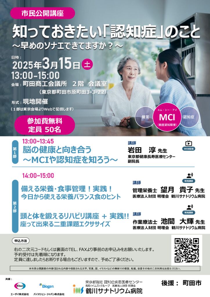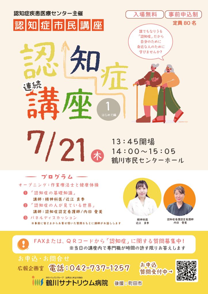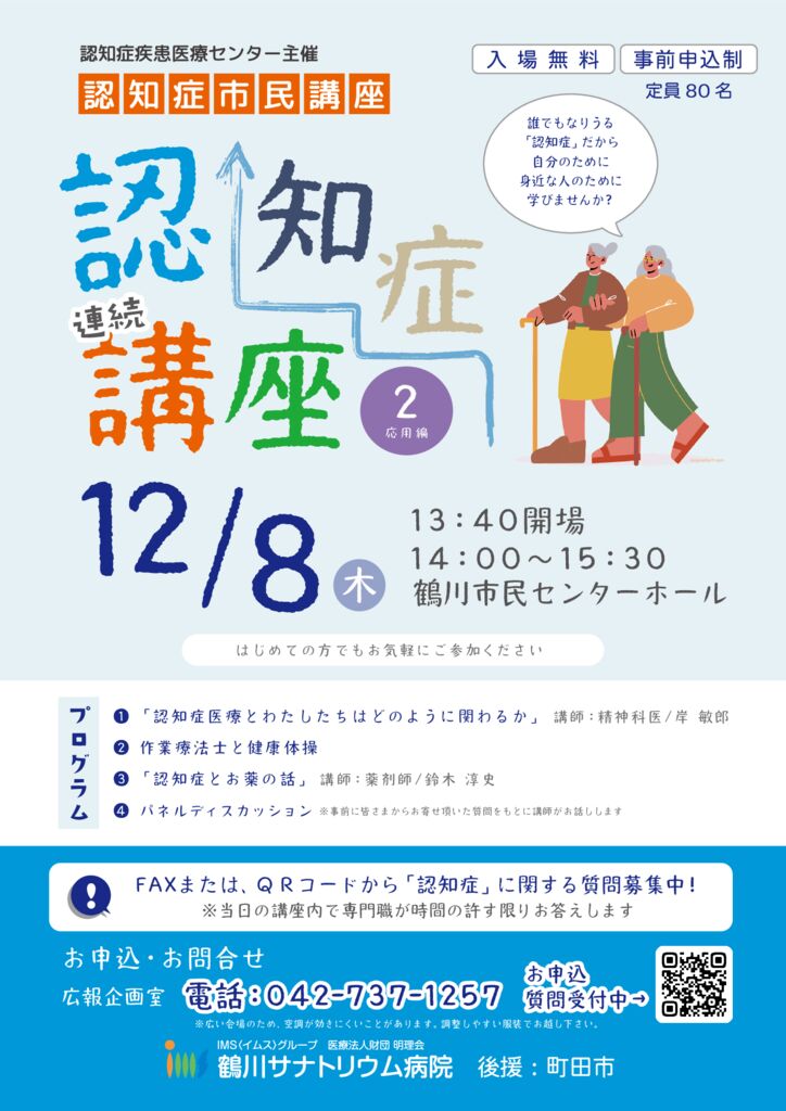 当院は認知症疾患医療センターとして、認知症専門医療の提供の他、地域への啓発などを行なっています。認知症は、自分やご家族、身近な人など、多くの人にとって「誰もがなりうる病気」です。認知症という疾患を正しく理解し、備えるため、その領域を専門とする医療専門職による医療講座です