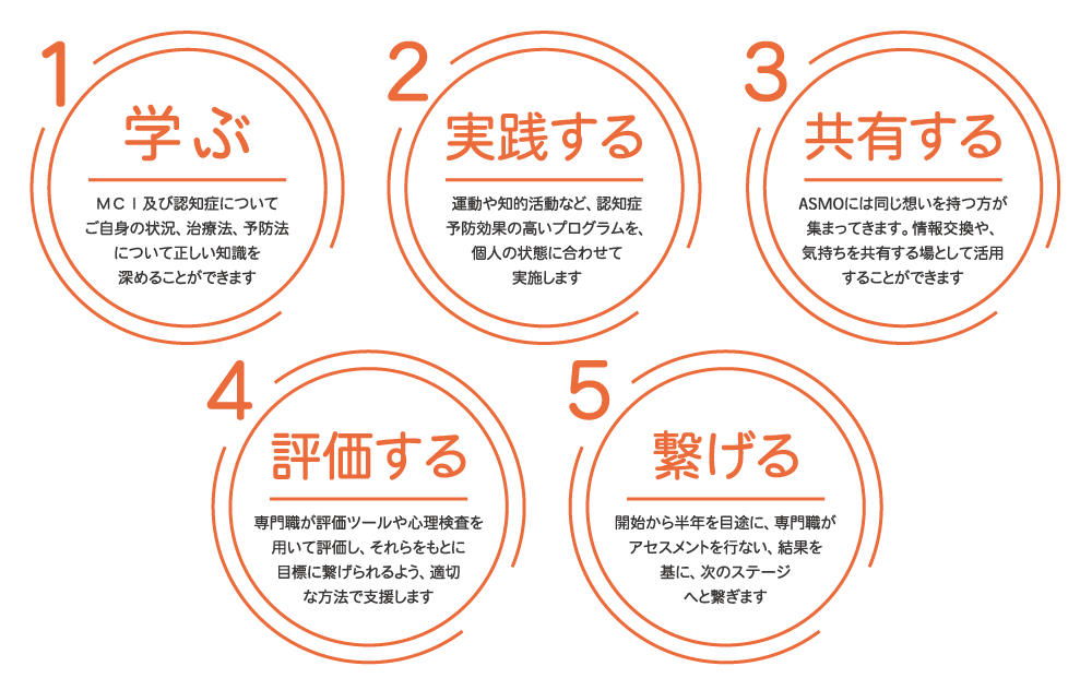 MCI トレーニングスタジオ「ASMO」では、そういった方々に対し、認知症の遅延と予防、心身機能の維持・改善を目指すプログラムを当院の作業療法士を中心とした専門職が提供するト レーニングスタジオです。
