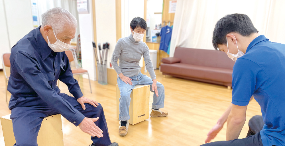 カホンは箱型で、楽器自体に座って楽器の側面やその縁を素手で叩いて演奏する楽器です。脳活性や、リズム曲を覚えることでの記憶力の改善にも期待ができます。また、リズム運動は脳内のセロトニン分泌を促進させるので、心の平穏などの効果にも期待ができます。